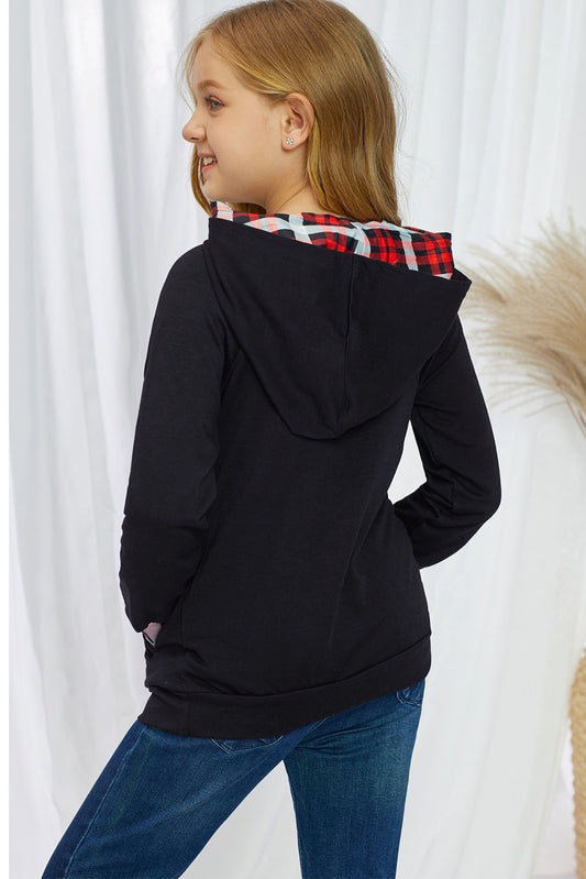 Girls Plaid Decorative Button Hoodie with Pockets