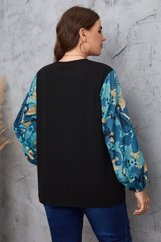 Plus Size Printed Notched Neck Long Sleeve Blouse