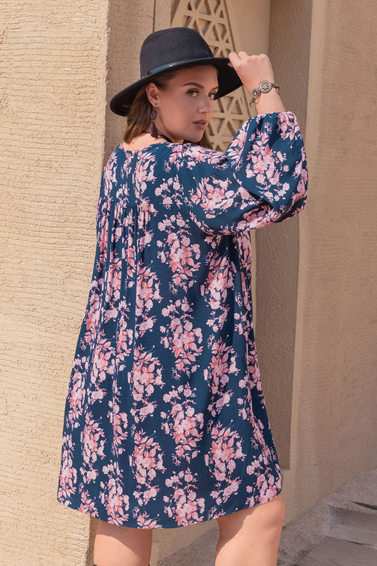 Plus Size Printed V-Neck Long Sleeve Mini Dress