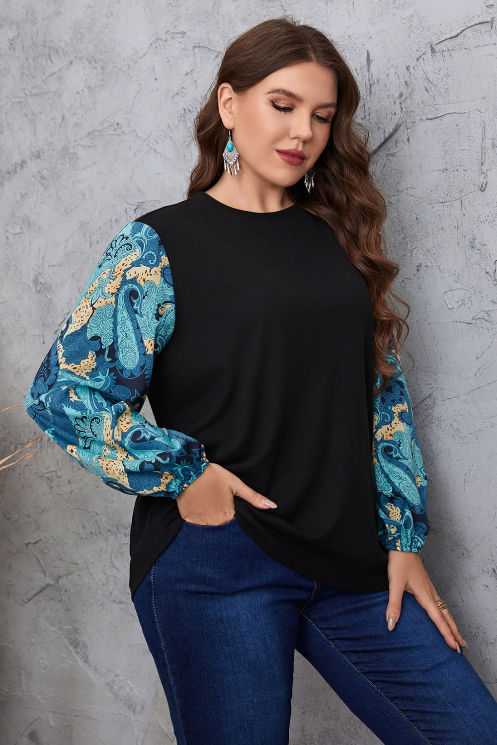 Melo Apparel Plus Size Printed Sleeve Round Neck Blouse