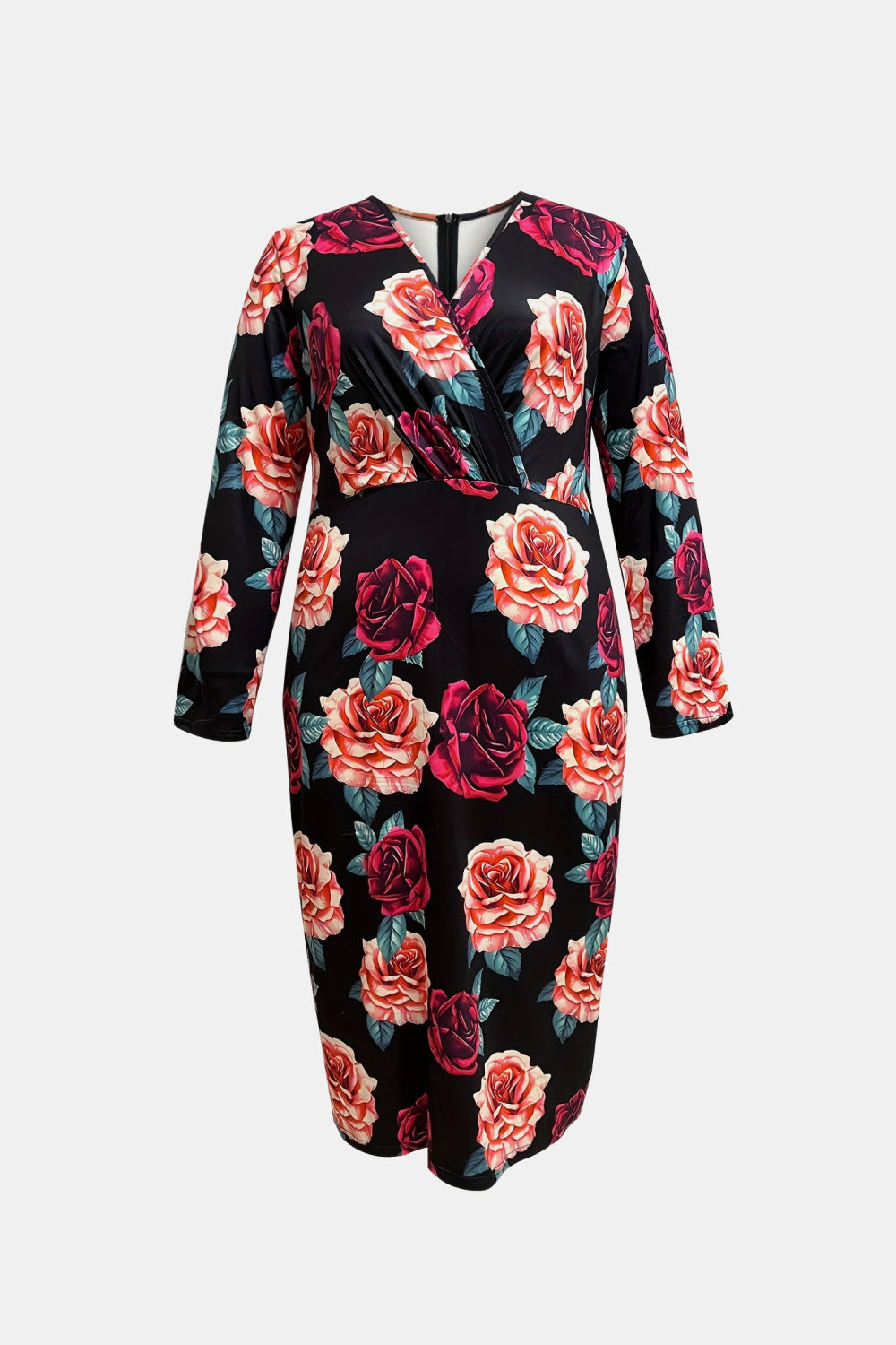 Plus Size Floral Print Surplice Neck Long Sleeve Dress